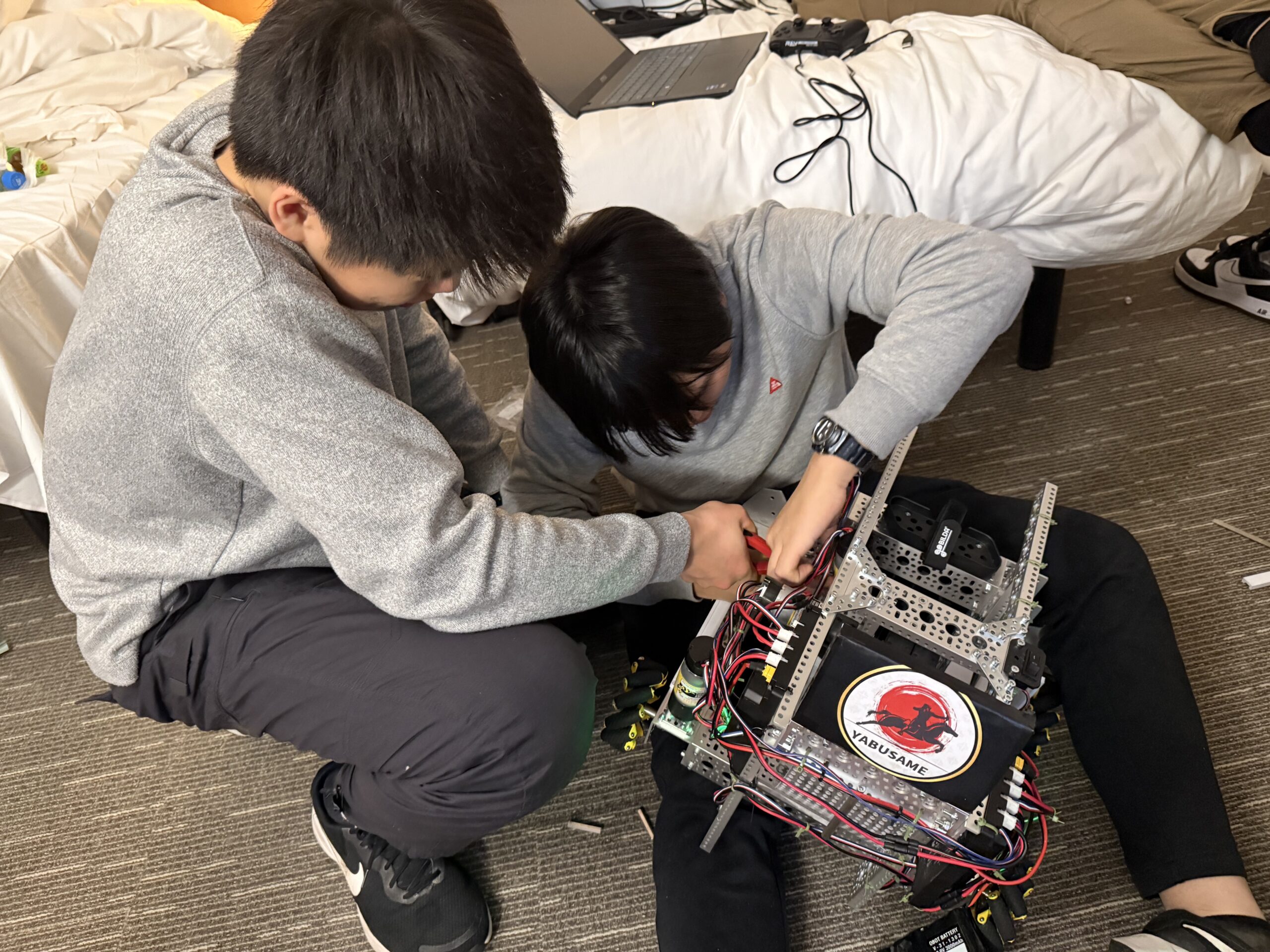 Today is the day before the tournament. In the hotel room, we made final adjustments for the robot.